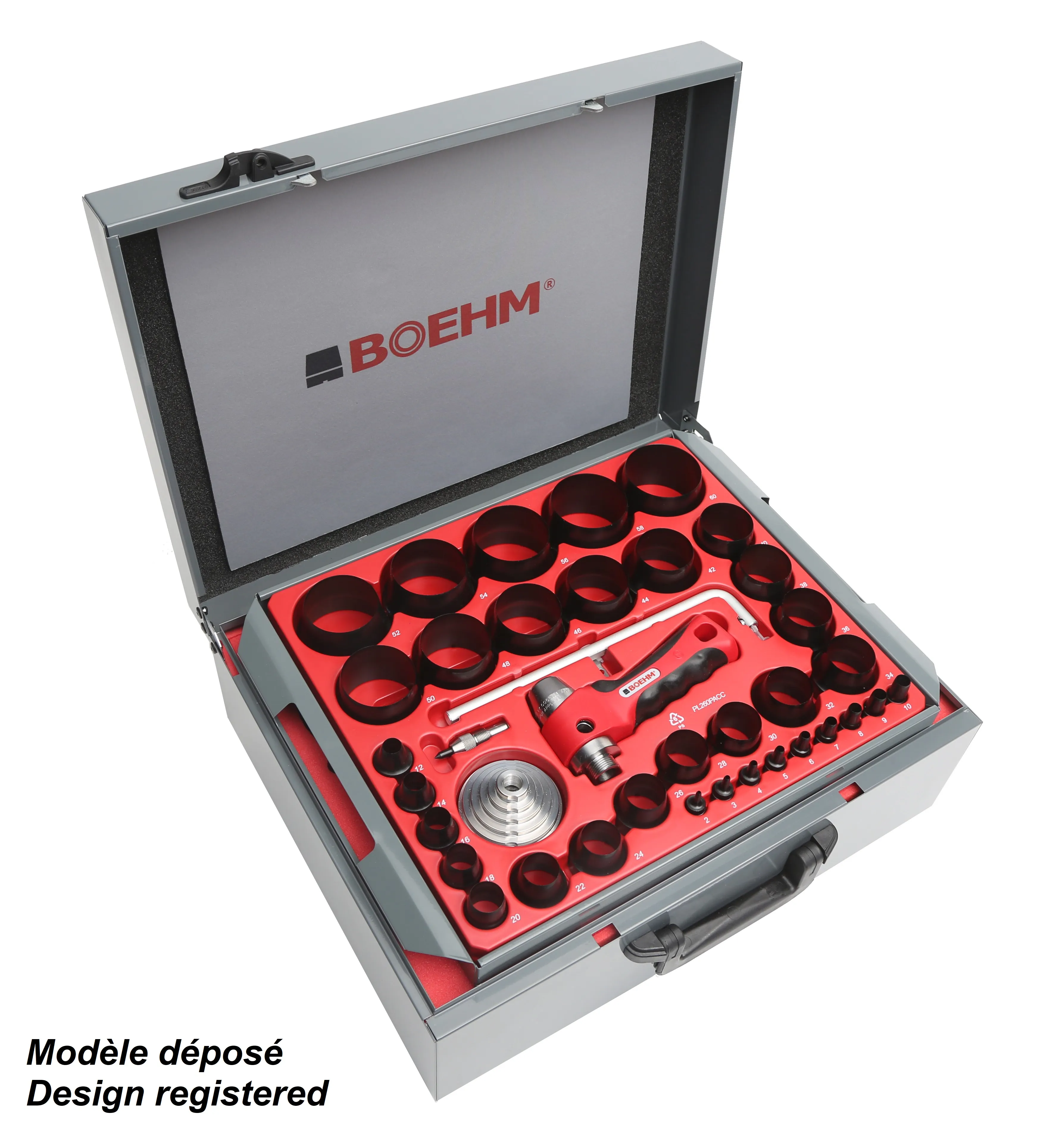 1er niveau avec un plateau amovible avec la même composition que notre coffret JLB260PACC 2ème niveau avec une planche de découpe PLAR4 et 20 emporte-pièces de 62 à 100 mm avec le mandrin JLBM100.